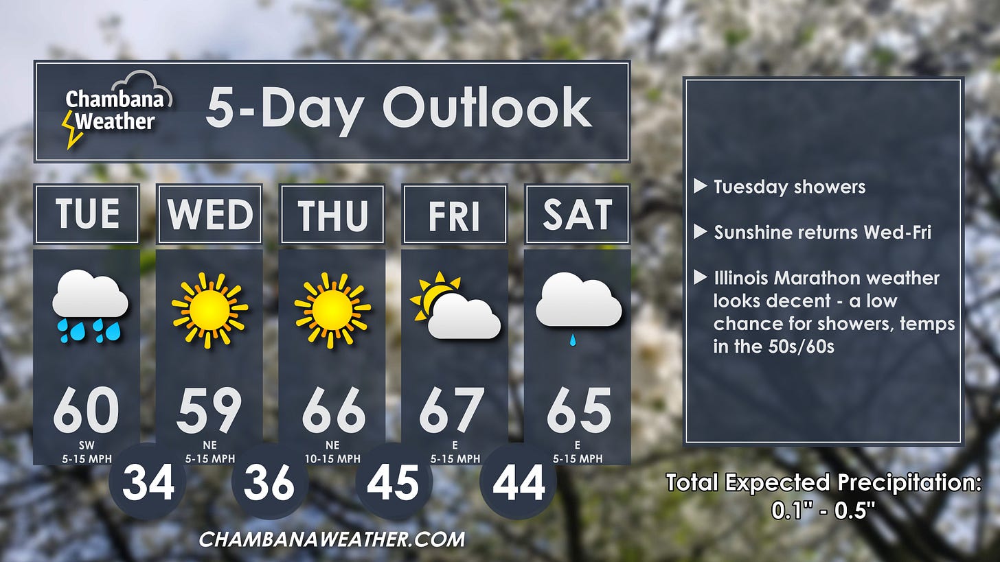 Good Tuesday morning! Scattered rain showers move through today, but sunshine is back tomorrow through Friday. Illinois Marathon weather looks pretty good - expecting mostly cloudy skies, a low chance of showers, and temperatures in the 50s/60s.