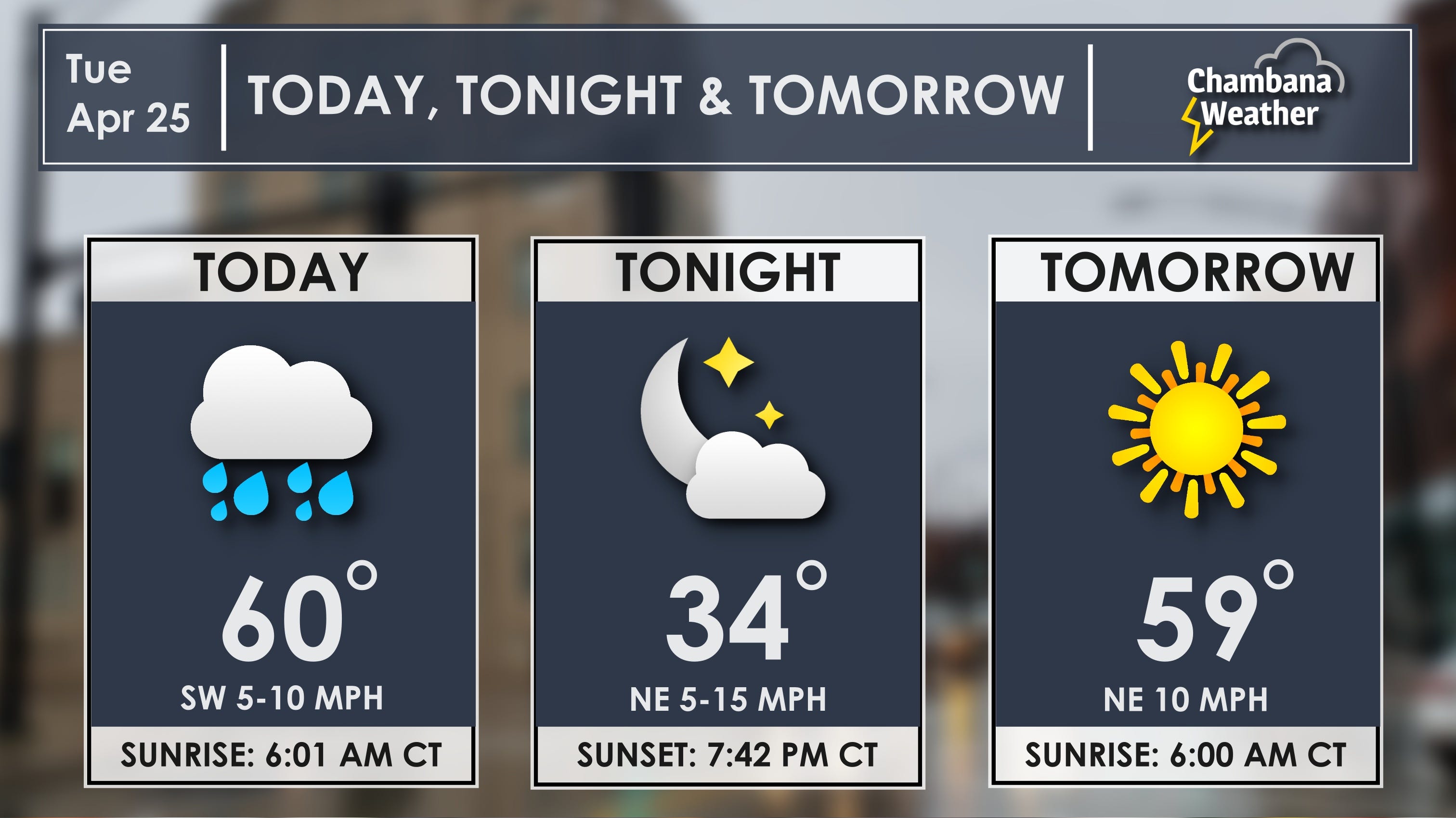 Here is your Champaign-Urbana Forecast from Chambana Weather Meteorologist Andrew Pritchard... For today, mostly cloudy with a chance of showers and a high of 60 degrees. Southwest wind 5 to 10 mph... Tonight, partly cloudy with a low of 34 degrees. Northeast wind 5 to 15 mph... Tomorrow, patchy frost in the morning, otherwise mostly sunny with a high of 59 degrees. Northeast wind 10 mph... Tomorrow night, partly cloudy with a low of 36 degrees. Northeast wind 5 to 10 mph... And for Thursday, mostly sunny with a high of 66 degrees. Southeast wind 10 mph.